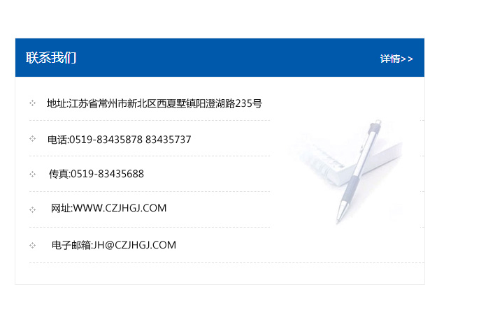 傳真:0519-83435688    郵編:213135    網(wǎng)址:WWW.czjhgj_com.kec188.com    電子郵箱:JH@czjhgj_com.kec188.com
